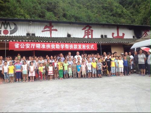 8月9日下午,省公安厅精准扶贫帮扶款发放仪式在默戎镇牛角山村部举行。省公安厅驻村工作队队长任杰书记、默戎镇党委书记姚祖军、驻镇工作组组长张忠富书记、牛角山村党支部书记龙献文以及受帮扶的学生、家长等130余人参加了本次活动。